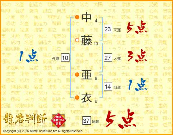 中(4画)藤(19画) 亜(8画)衣(6画)