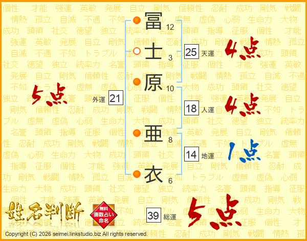 冨(12画)士(3画)原(10画) 亜(8画)衣(6画)