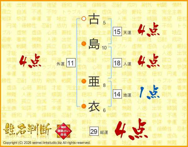 古(5画)島(10画) 亜(8画)衣(6画)
