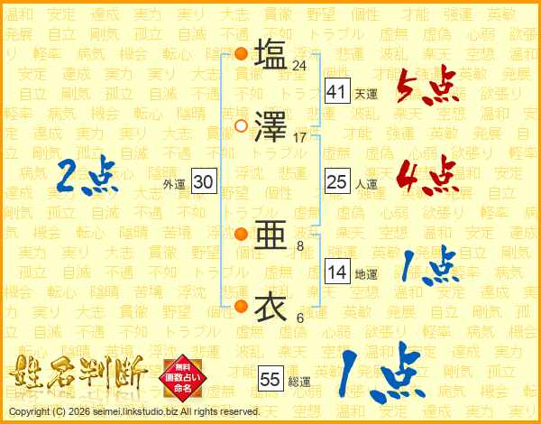 塩(24画)澤(17画) 亜(8画)衣(6画)