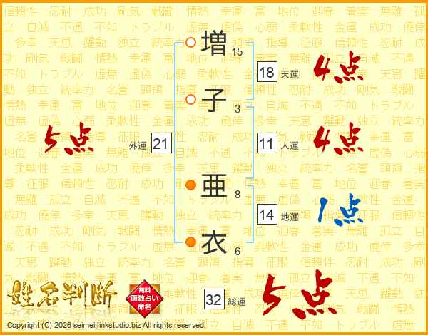増(15画)子(3画) 亜(8画)衣(6画)