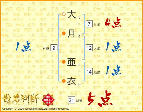 生活面を象徴する運勢です。外部から受ける影響力を表し、結婚運、家庭運や職場、環境への順応性を表します。総運から人運を引いた画数。姓や名が1文字の場合を除く。