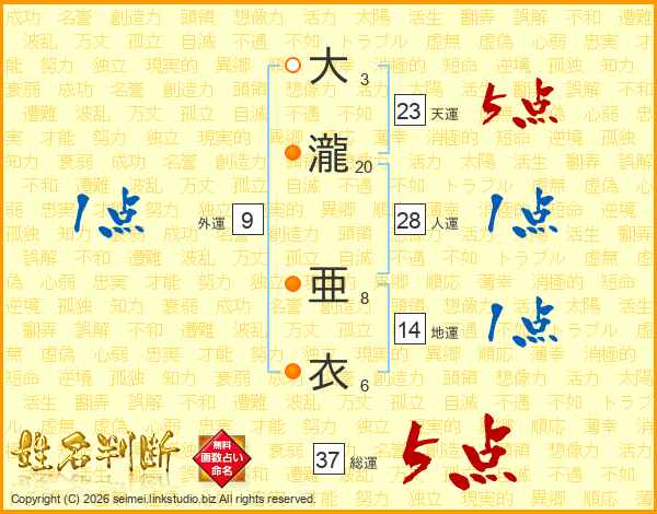 大(3画)瀧(20画) 亜(8画)衣(6画)