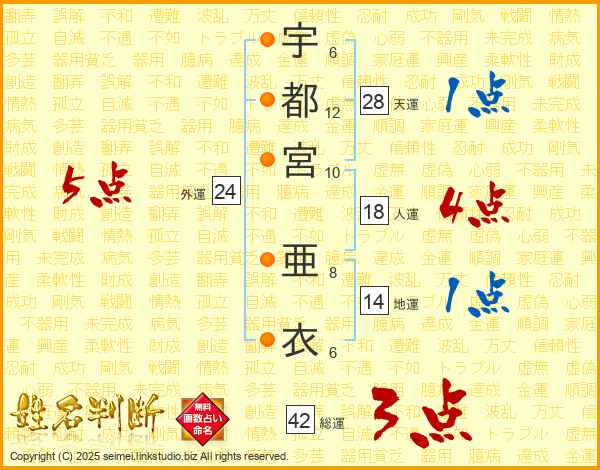 宇(6画)都(12画)宮(10画) 亜(8画)衣(6画)
