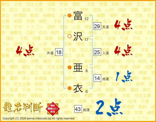 富沢亜衣さんの総運は43画の2点!