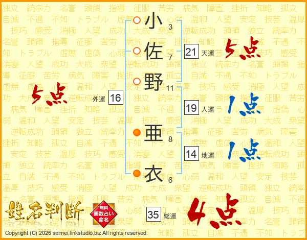 小佐野亜衣さんの総運は35画の4点!