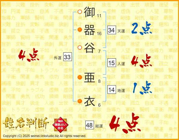 御(11画)器(16画)谷(7画) 亜(8画)衣(6画)