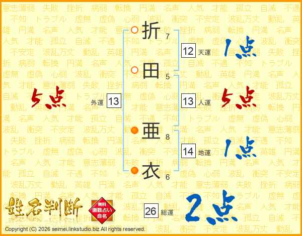 生活面を象徴する運勢です。外部から受ける影響力を表し、結婚運、家庭運や職場、環境への順応性を表します。総運から人運を引いた画数。姓や名が1文字の場合を除く。