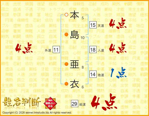 あなたの人生を表す1番重要な運勢です。生涯を通じて影響する総合運となり、主に50歳以降の晩年期に影響を及ぼします。苗字と名前の合計画数。