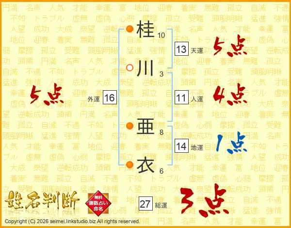 桂(10画)川(3画) 亜(8画)衣(6画)