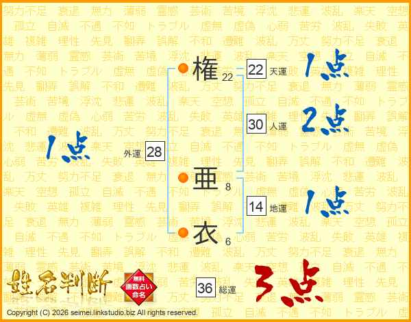 生活面を象徴する運勢です。外部から受ける影響力を表し、結婚運、家庭運や職場、環境への順応性を表します。総運から人運を引いた画数。姓や名が1文字の場合を除く。