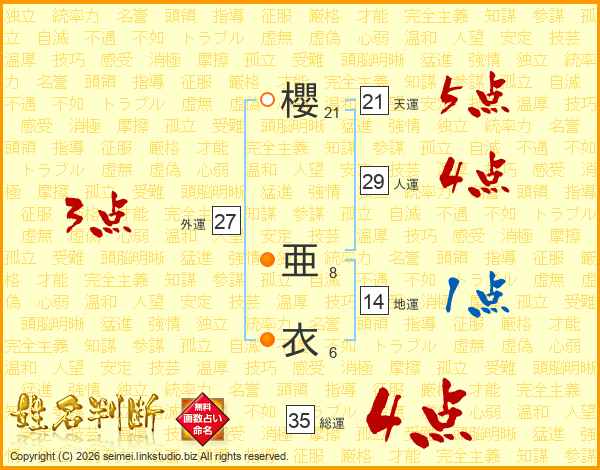 櫻亜衣さんの総運は35画の4点!