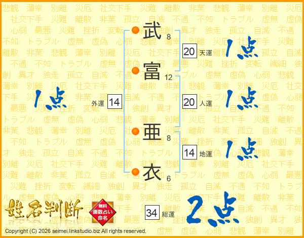 武(8画)富(12画) 亜(8画)衣(6画)
