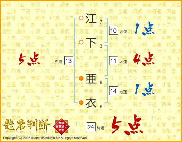 生活面を象徴する運勢です。外部から受ける影響力を表し、結婚運、家庭運や職場、環境への順応性を表します。総運から人運を引いた画数。姓や名が1文字の場合を除く。