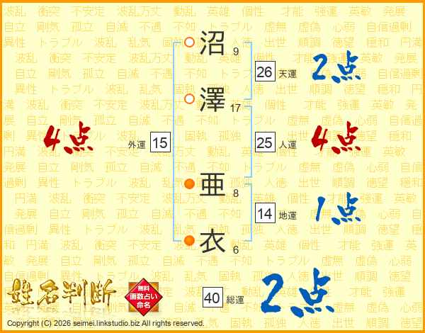 沼(9画)澤(17画) 亜(8画)衣(6画)