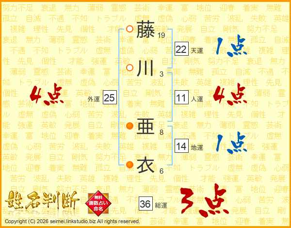 藤(19画)川(3画) 亜(8画)衣(6画)