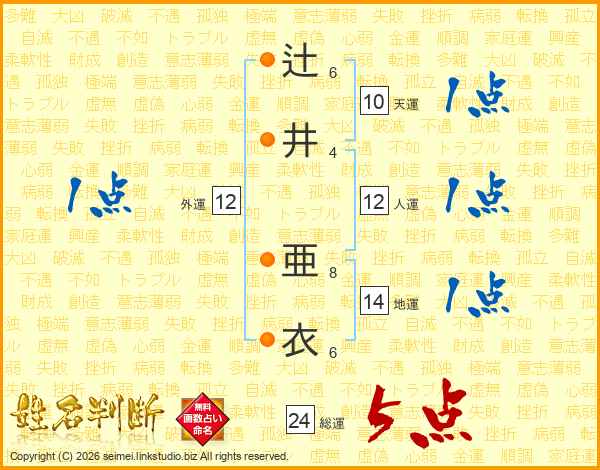 辻(6画)井(4画) 亜(8画)衣(6画)