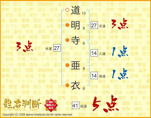 道(13画)明(8画)寺(6画) 亜(8画)衣(6画)