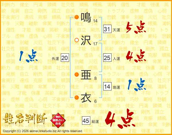 鳴(14画)沢(17画) 亜(8画)衣(6画)
