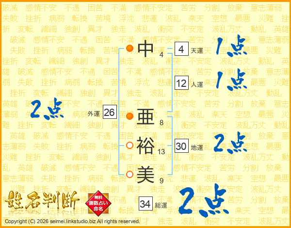 生活面を象徴する運勢です。外部から受ける影響力を表し、結婚運、家庭運や職場、環境への順応性を表します。総運から人運を引いた画数。姓や名が1文字の場合を除く。