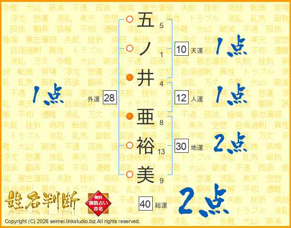 五(5画)ノ(1画)井(4画) 亜(8画)裕(13画)美(9画)