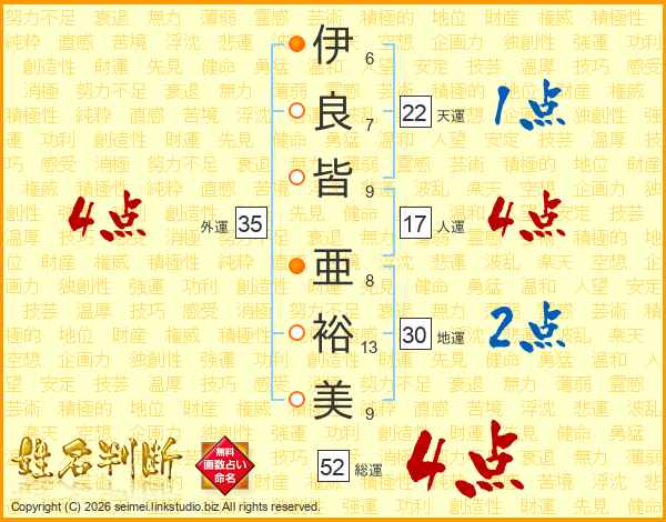 伊(6画)良(7画)皆(9画) 亜(8画)裕(13画)美(9画)
