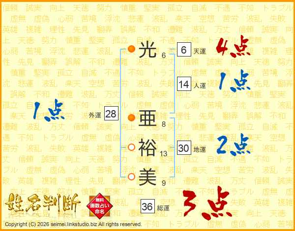 生活面を象徴する運勢です。外部から受ける影響力を表し、結婚運、家庭運や職場、環境への順応性を表します。総運から人運を引いた画数。姓や名が1文字の場合を除く。