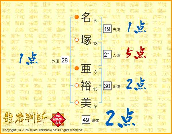 名(6画)塚(13画) 亜(8画)裕(13画)美(9画)