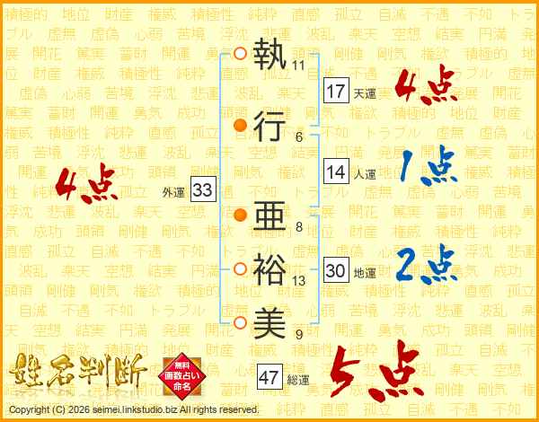 執(11画)行(6画) 亜(8画)裕(13画)美(9画)