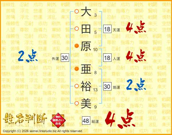 大(3画)田(5画)原(10画) 亜(8画)裕(13画)美(9画)