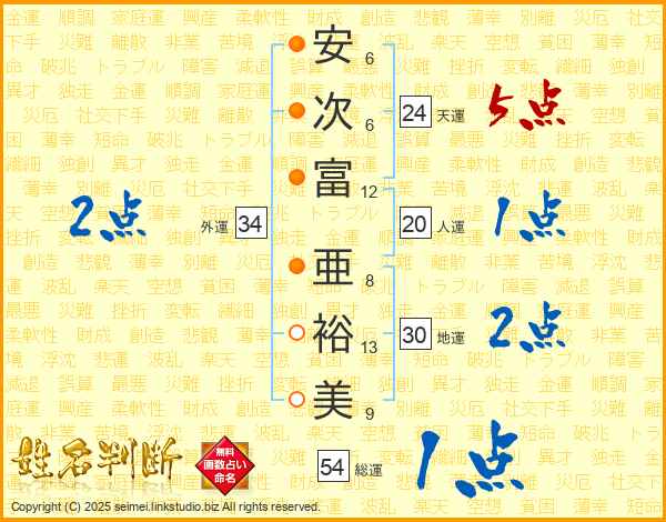 安(6画)次(6画)富(12画) 亜(8画)裕(13画)美(9画)