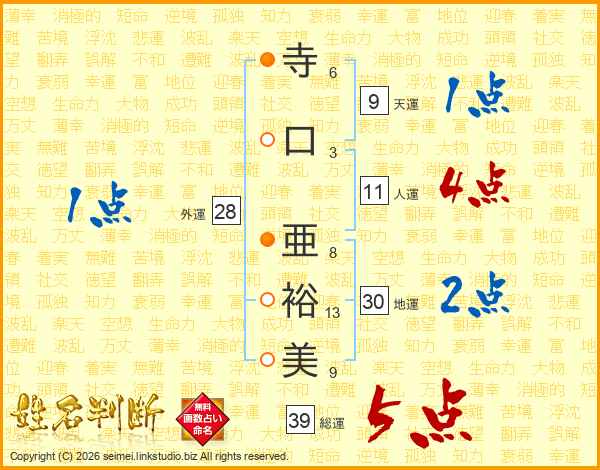 寺口亜裕美さんの総運は39画の5点!