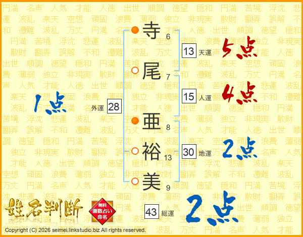 寺尾亜裕美さんの天運は13画の5点!