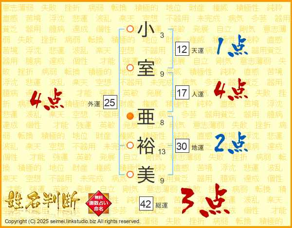 小(3画)室(9画) 亜(8画)裕(13画)美(9画)