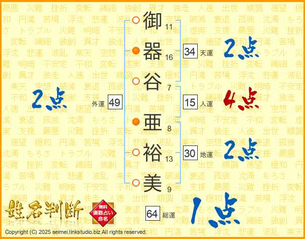 御(11画)器(16画)谷(7画) 亜(8画)裕(13画)美(9画)