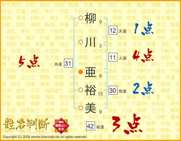 柳(9画)川(3画) 亜(8画)裕(13画)美(9画)