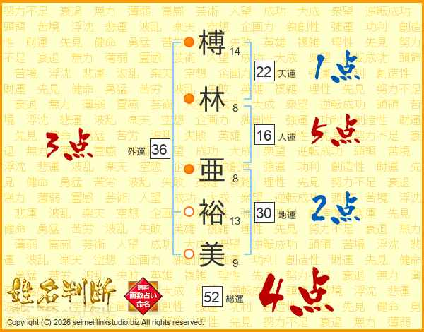 榑林亜裕美さんの総運は52画の4点!