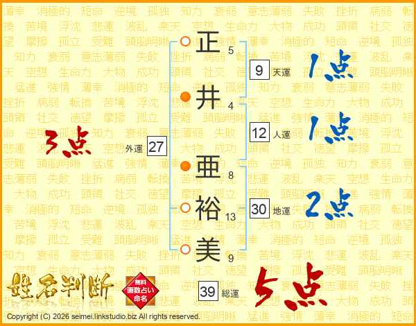正井亜裕美さんの総運は39画の5点!
