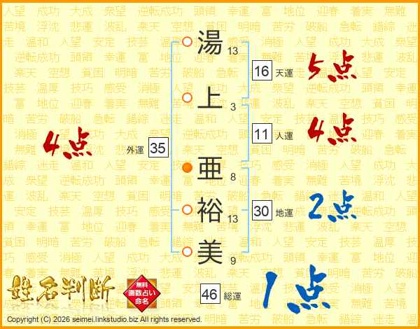 湯(13画)上(3画) 亜(8画)裕(13画)美(9画)