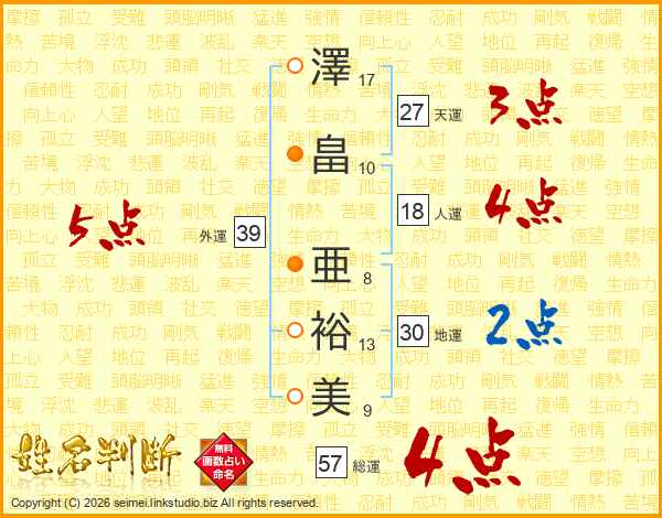 澤(17画)畠(10画) 亜(8画)裕(13画)美(9画)