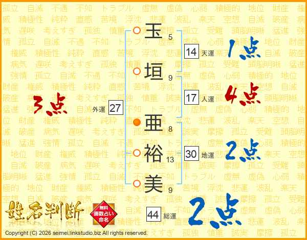 玉垣亜裕美さんの総運は44画の2点!
