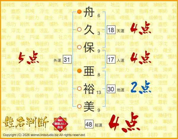 舟(6画)久(3画)保(9画) 亜(8画)裕(13画)美(9画)