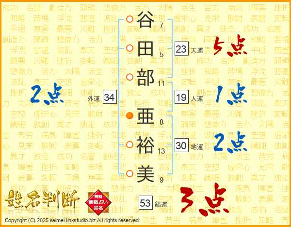 谷(7画)田(5画)部(11画) 亜(8画)裕(13画)美(9画)