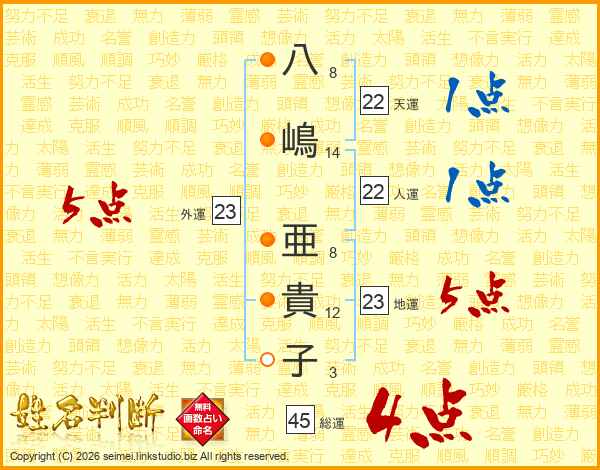 八(8画)嶋(14画) 亜(8画)貴(12画)子(3画)