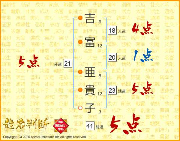 吉(6画)富(12画) 亜(8画)貴(12画)子(3画)