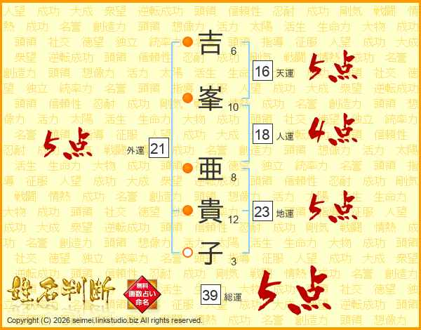 吉(6画)峯(10画) 亜(8画)貴(12画)子(3画)