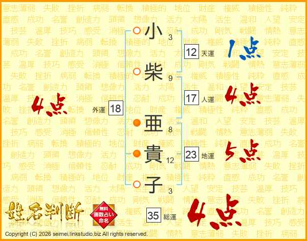 小(3画)柴(9画) 亜(8画)貴(12画)子(3画)