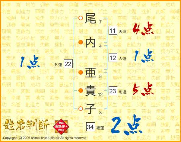 尾(7画)内(4画) 亜(8画)貴(12画)子(3画)