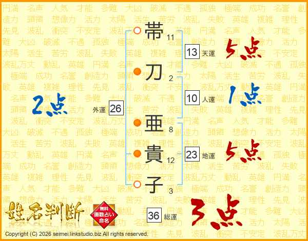 帯(11画)刀(2画) 亜(8画)貴(12画)子(3画)