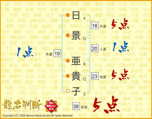 日(4画)景(12画) 亜(8画)貴(12画)子(3画)